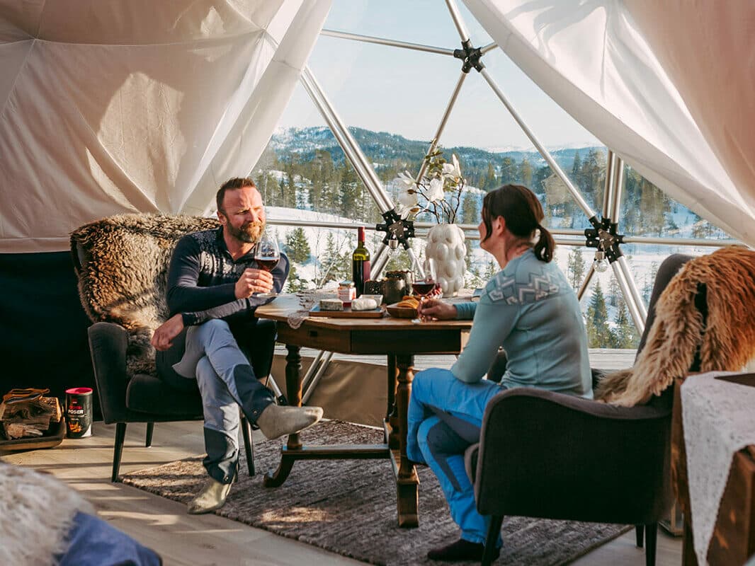 Arctic Dome Namdalen er ikke en hvilken som helst overnatting. Det luksuriøse glampingteltet er utstyrt med en king size dobbeltseng, varme dundyner, komfortable lenestoler og panoramautsikt mot himmelen og naturen rundt. Her kan du sovne til lyden av vinden som rasler i trærne og våkne til fuglekvitter og frisk fjelluft.